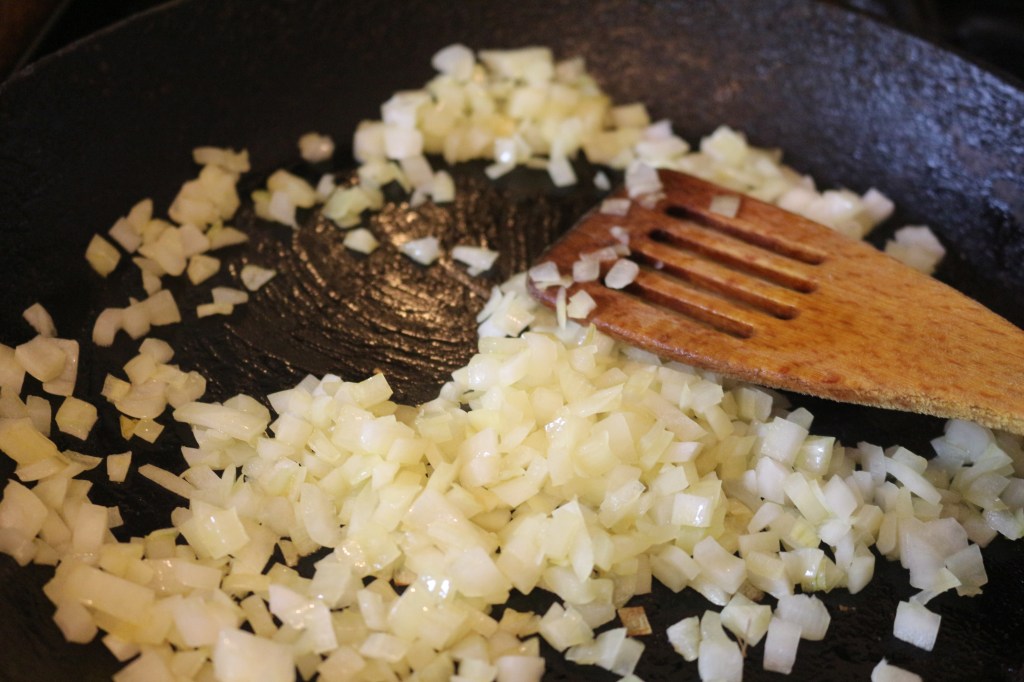 - Begin by heating a splash of oil in a pan over a medium heat. When hot, add in the onion and fry until they become translucent.