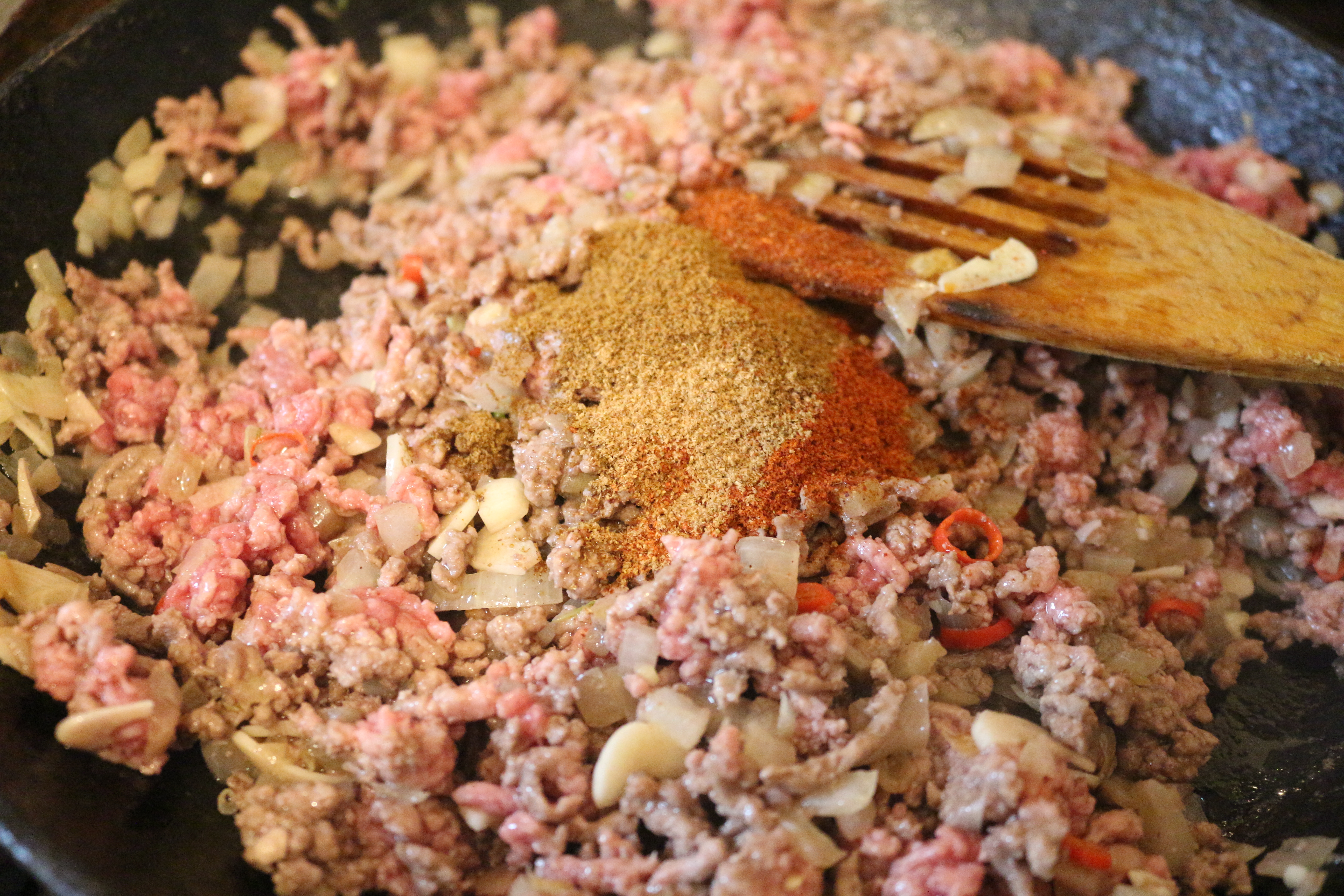 - When more than half the mince is browned, add in the spices. Doing this when the meat isn’t fully cooked means that, rather than the spices just flavouring the sauce, they infuse with the mince as it browns! Give everything a good mix together, keeping the mince mixture moving around the pan.
