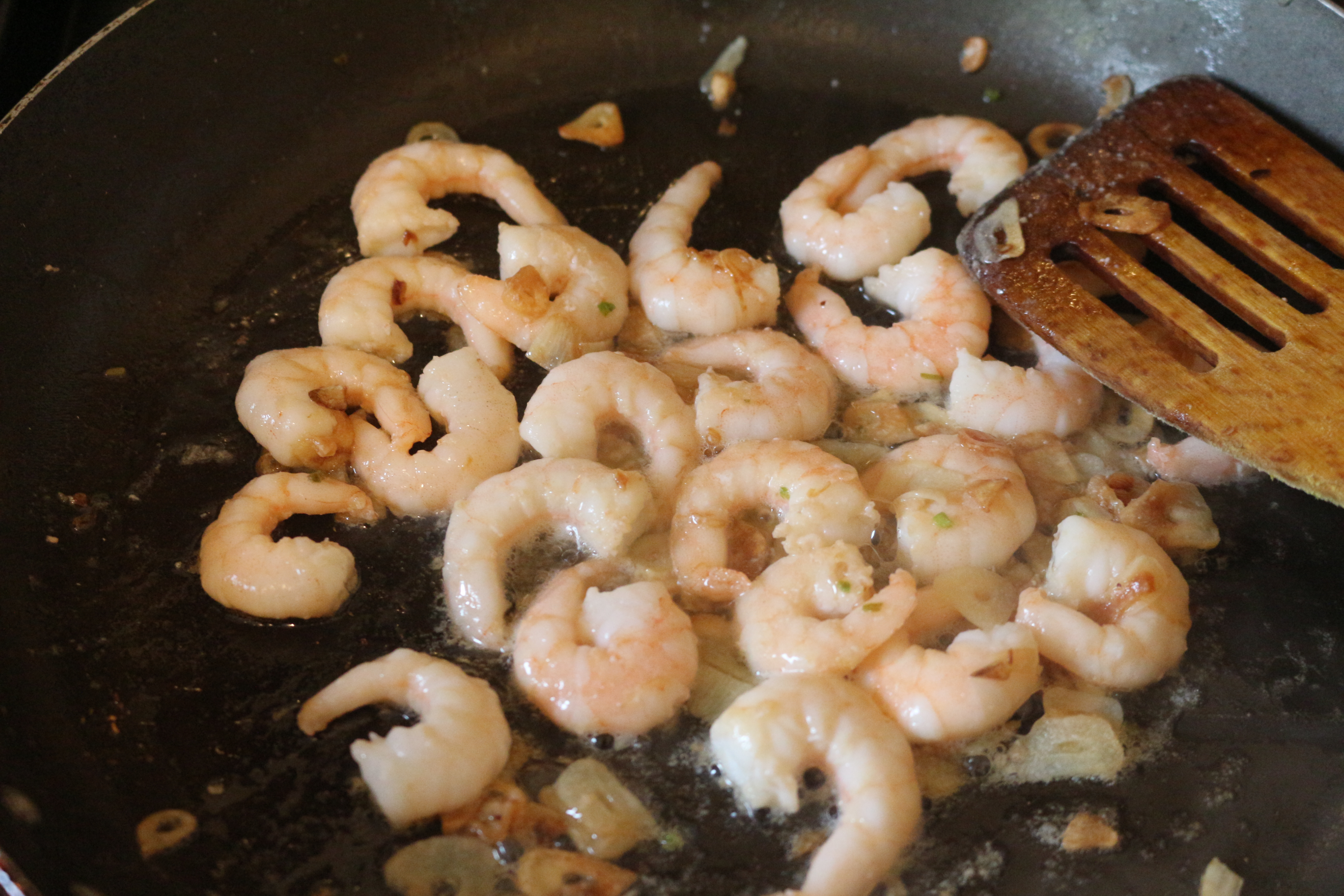 - Heat a good glug of oil in a frying pan or wok over a medium heat. When hot, add in the sliced garlic and stir continuously. Just as the garlic begins to brown (you want them to become a golden brown colour, which means that they’ll have a nice crunchy texture, but DO NOT burn them!) chuck in the prawns and cook for a further 2-3 minutes, until they have turned from grey to pink.