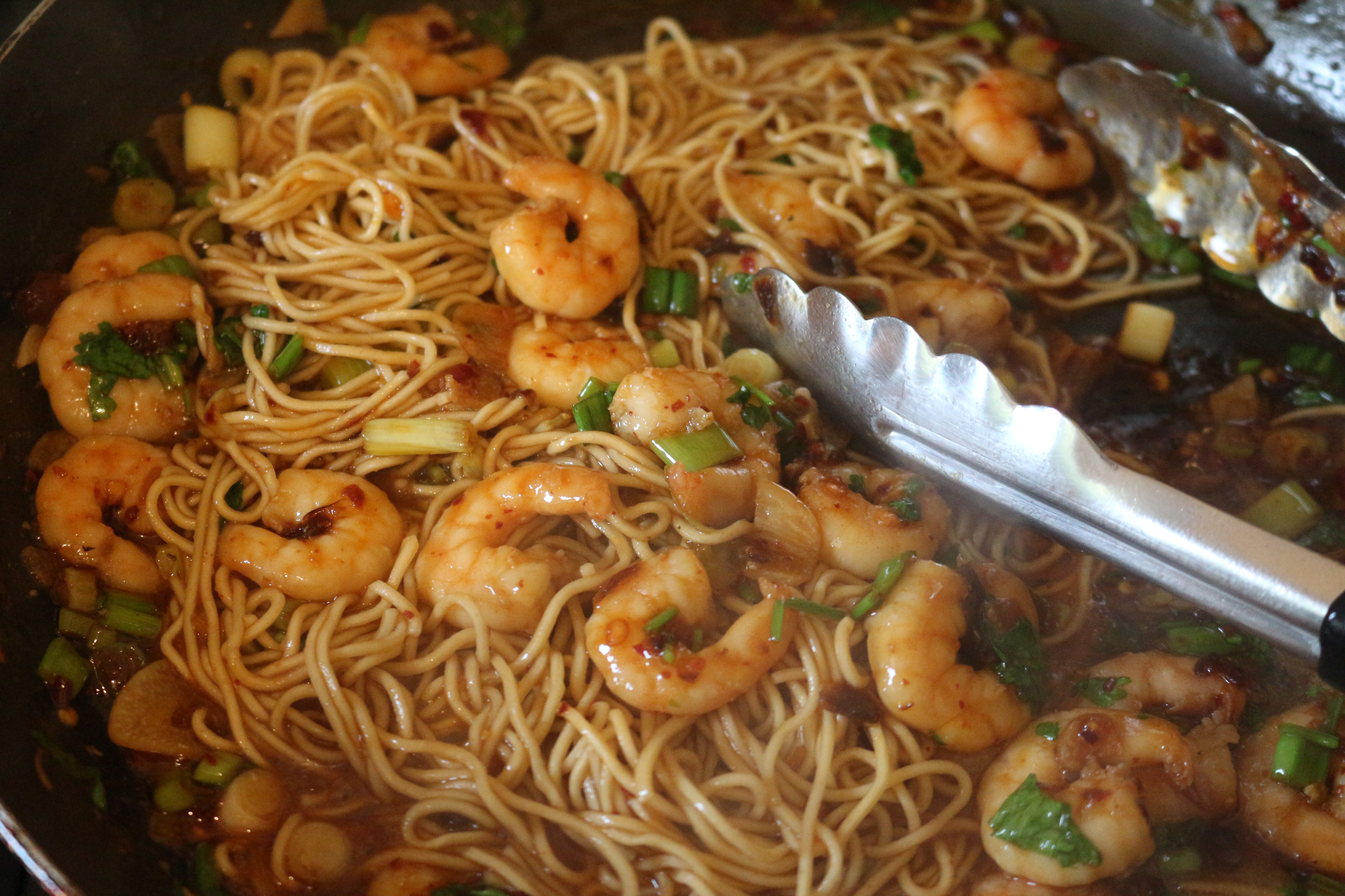 - Add these into the pan along with the drained noodles and give everything a thorough mix together, so that the sauce is covering everything in the pan! (Using tongs is good for this as noodles are notorious for clinging together).