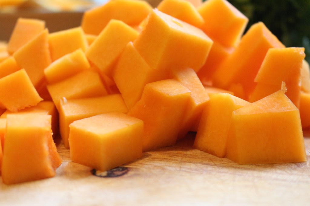 - Now to prepare the butternut squash! This can seem a little daunting, but don’t be scared. Lay the squash on a chopping board, and cut in half to separate the neck from the base. To peel, simply stand the both parts of the squash flat side down, and slice off the skin using a sharp knife. Scoop out the seeds and stringy flesh, and roughly chop into cubes.