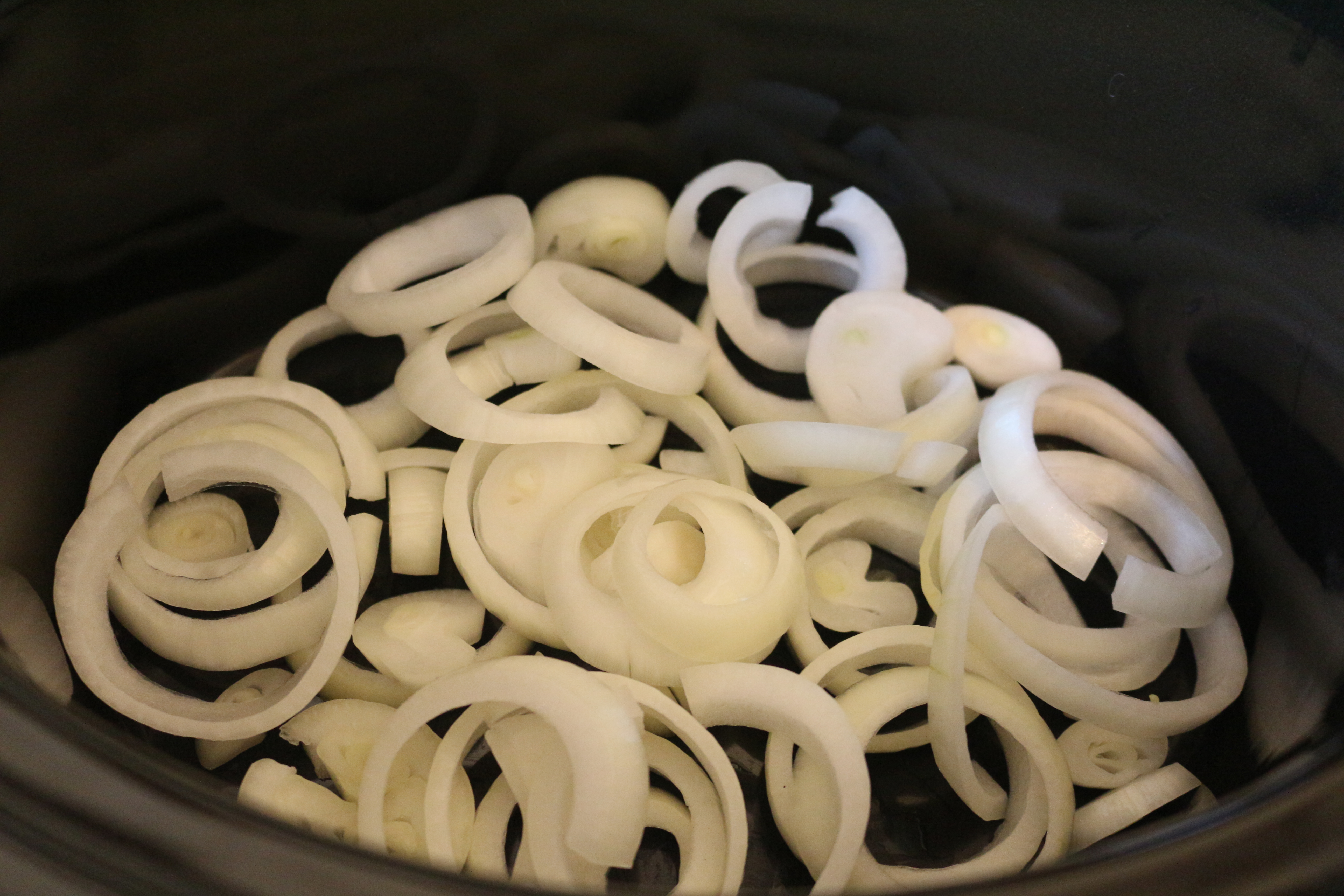 - Peel the onions and carefully slice into rings and layer into the bottom of the slow cooker.