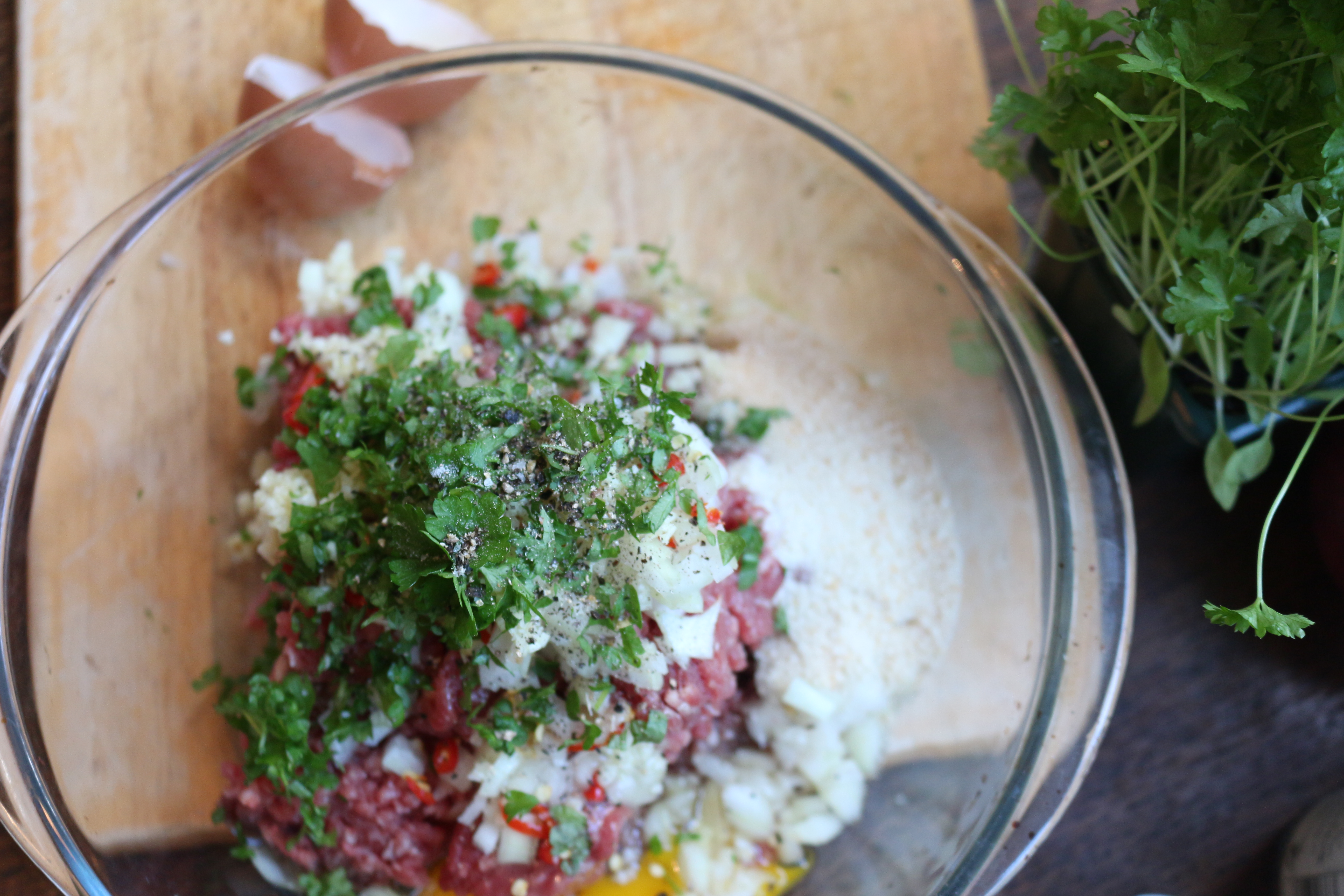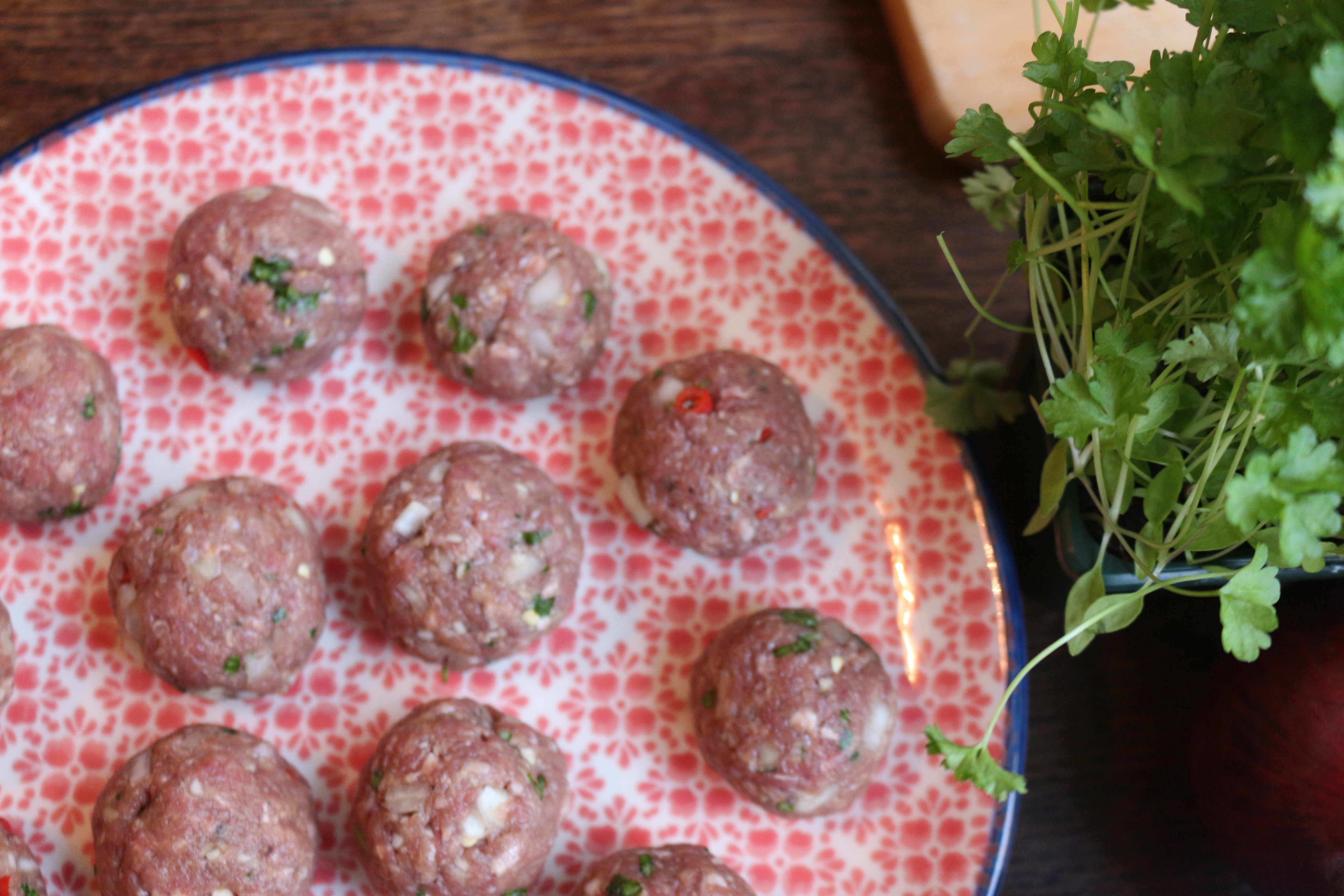 - Begin by preparing the meatballs so that they can chill for at least 30 mins in the fridge. In a large bowl, bind all the ingredients listed for the meatballs. Spoons don’t really help much here, better to get stuck in with your hands so that the mixture is properly mixed together (gloves are recommended!).