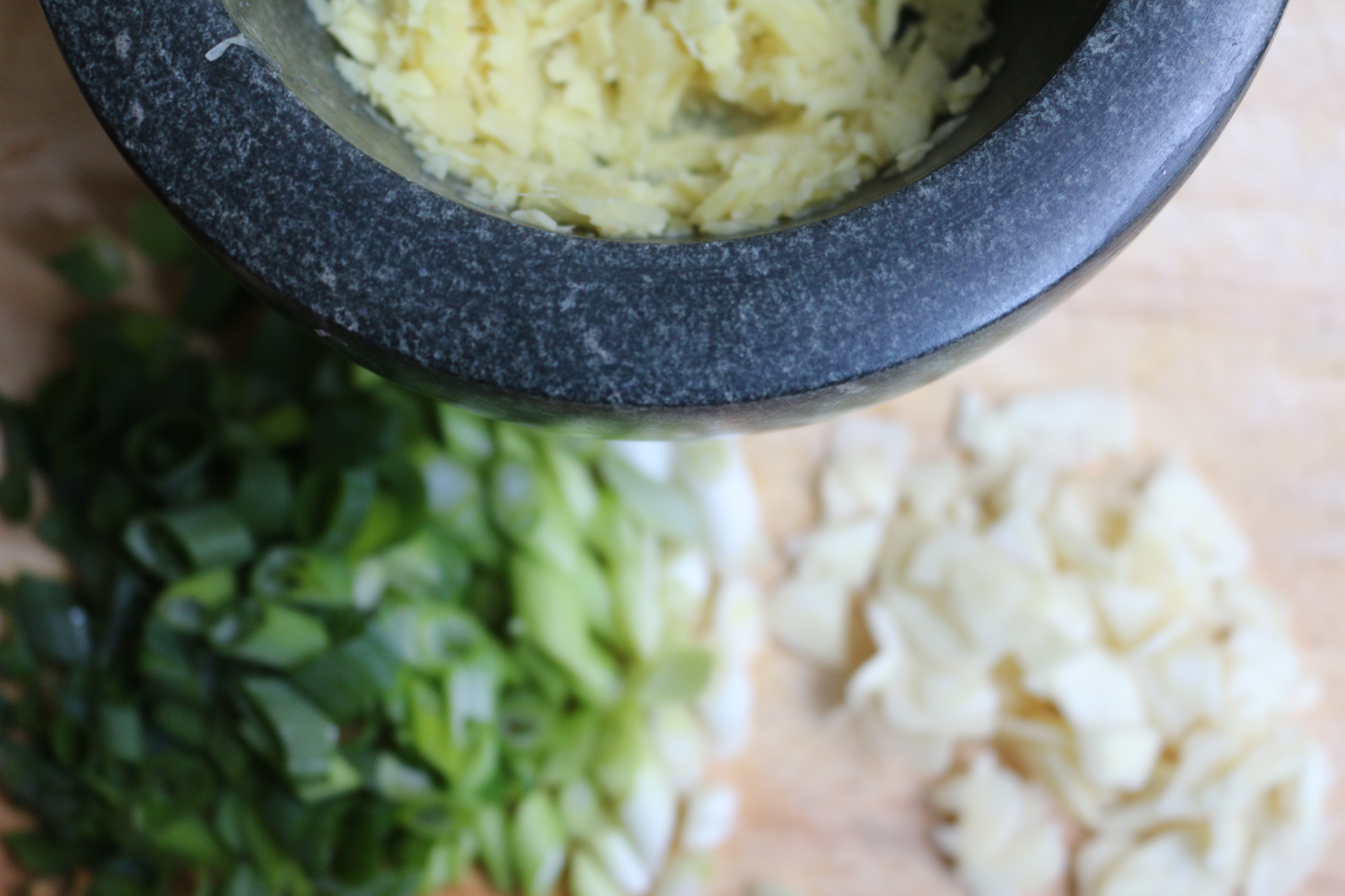- a decent sized wedge of ginger, peeled and crushed in a pestle and mortar, or finely sliced