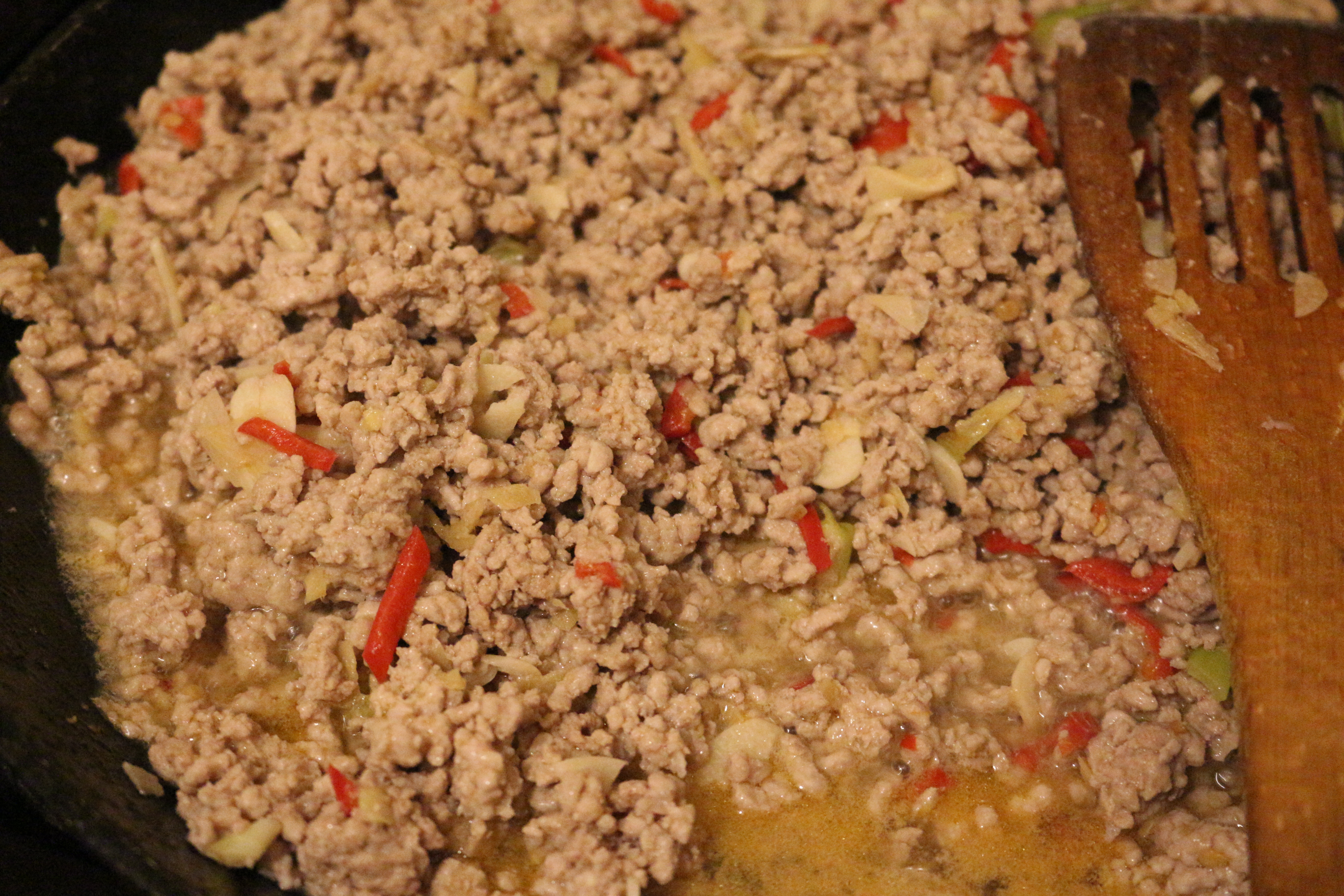 - Add in the pork mince and break everything up in the pan, making sure everything is moving around and nothing is sticking. Once the meat is browned, pour over the remaining sauce ingredients and the sugar. Give everything a good mix together. Let this cook for a further 4/5 minutes.