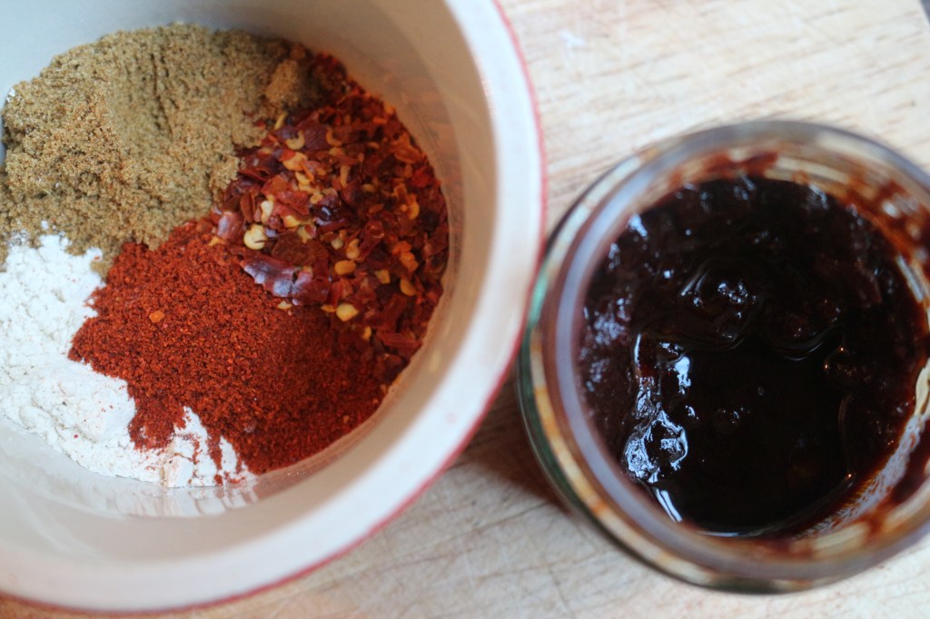 - In a small bowl, mix together to dry spices, chipotle paste and about a tablespoon of water so that it forms a paste. Put the chicken in a separate large bowl and- as gross as it might be- use your hands to rub the paste over all the chicken, making sure to get into any cracks and crevices to ensure its evenly coated. Cover with clingfilm and leave to one side. It’s not necessary to marinate the chicken for ages, but if you do this before prepping the salsa and guacamole, it gives it a little time to soak up the flavour.