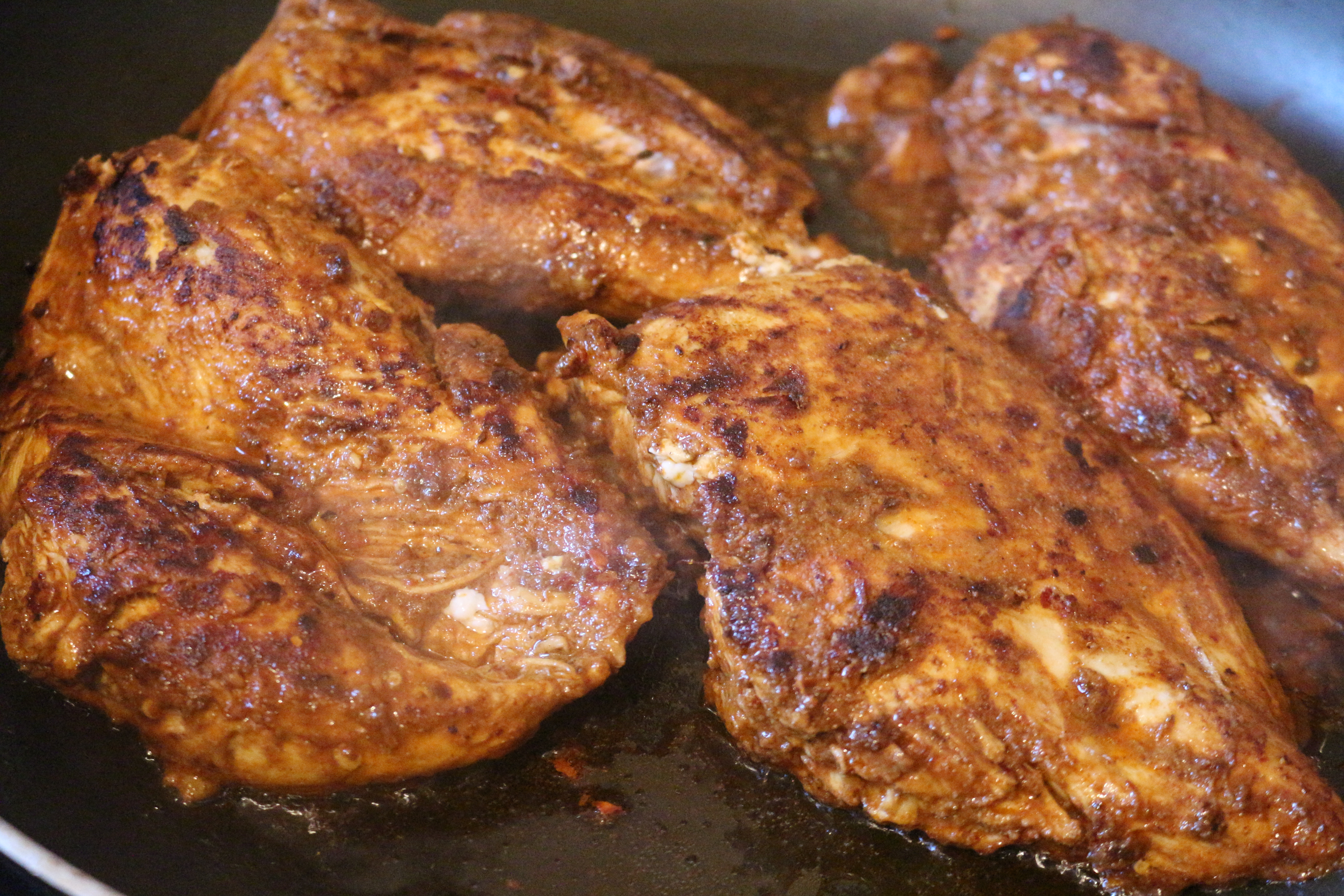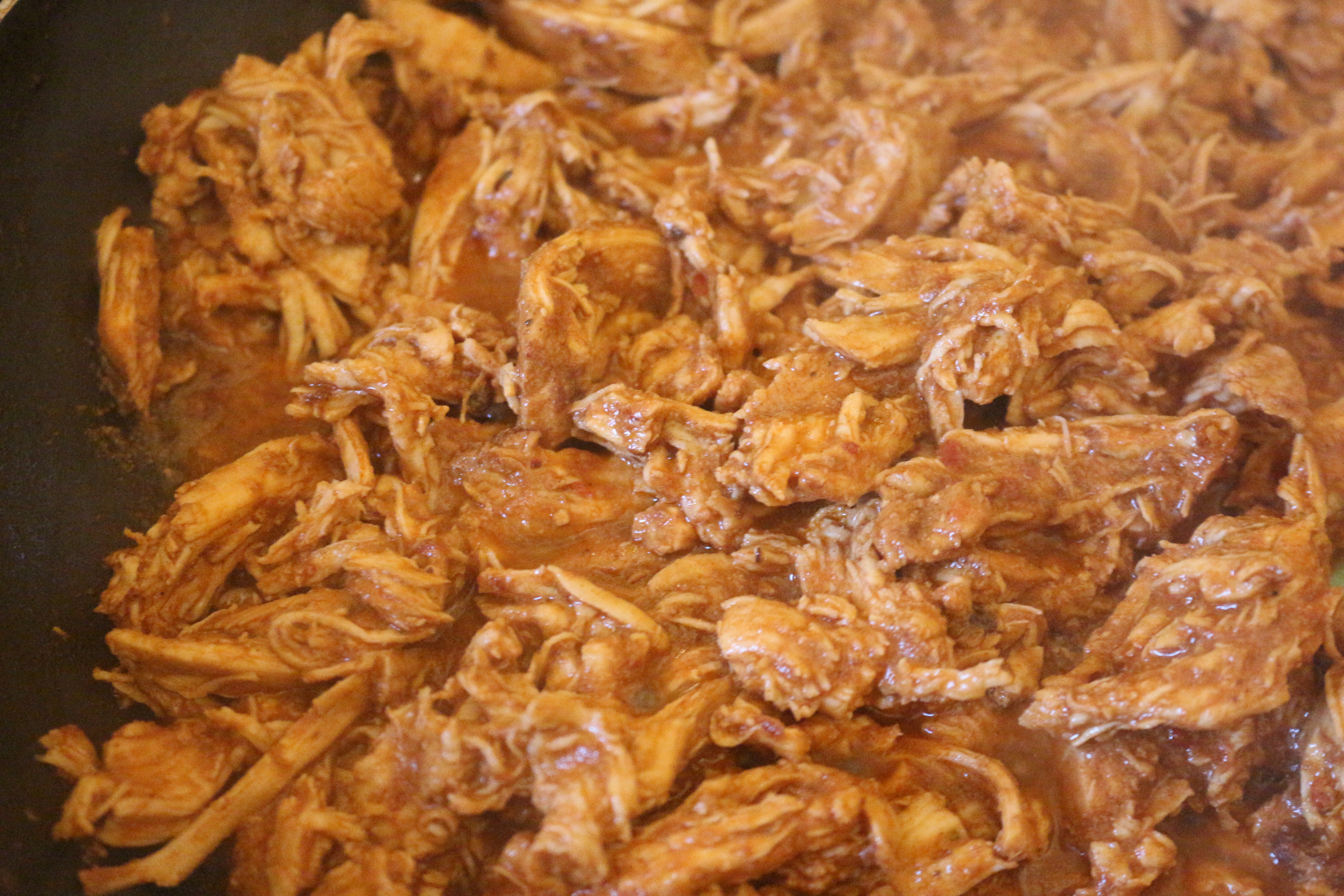 - In a large pan, heat about a tablespoon of oil. Add the chicken (but don’t wash up the bowl it was just sat in!) and fry for 3-4 minutes on each side, until brown. Then remove, and shred with 2 forks. Don’t fret if some of the chicken is still a little pink inside, this will all cook when simmering in the sauce. In the bowl with the leftover marinade, add the chicken stock and tomato puree and mix everything together, making sure to get all to last scraps of marinade. Return the chicken to the pan, with the sauce, and over a medium heat, continue to cook for about 5 minutes, until the chicken is done and the sauce has thickened a little (and any of those raw chicken juices have cooked off!). Season to taste.