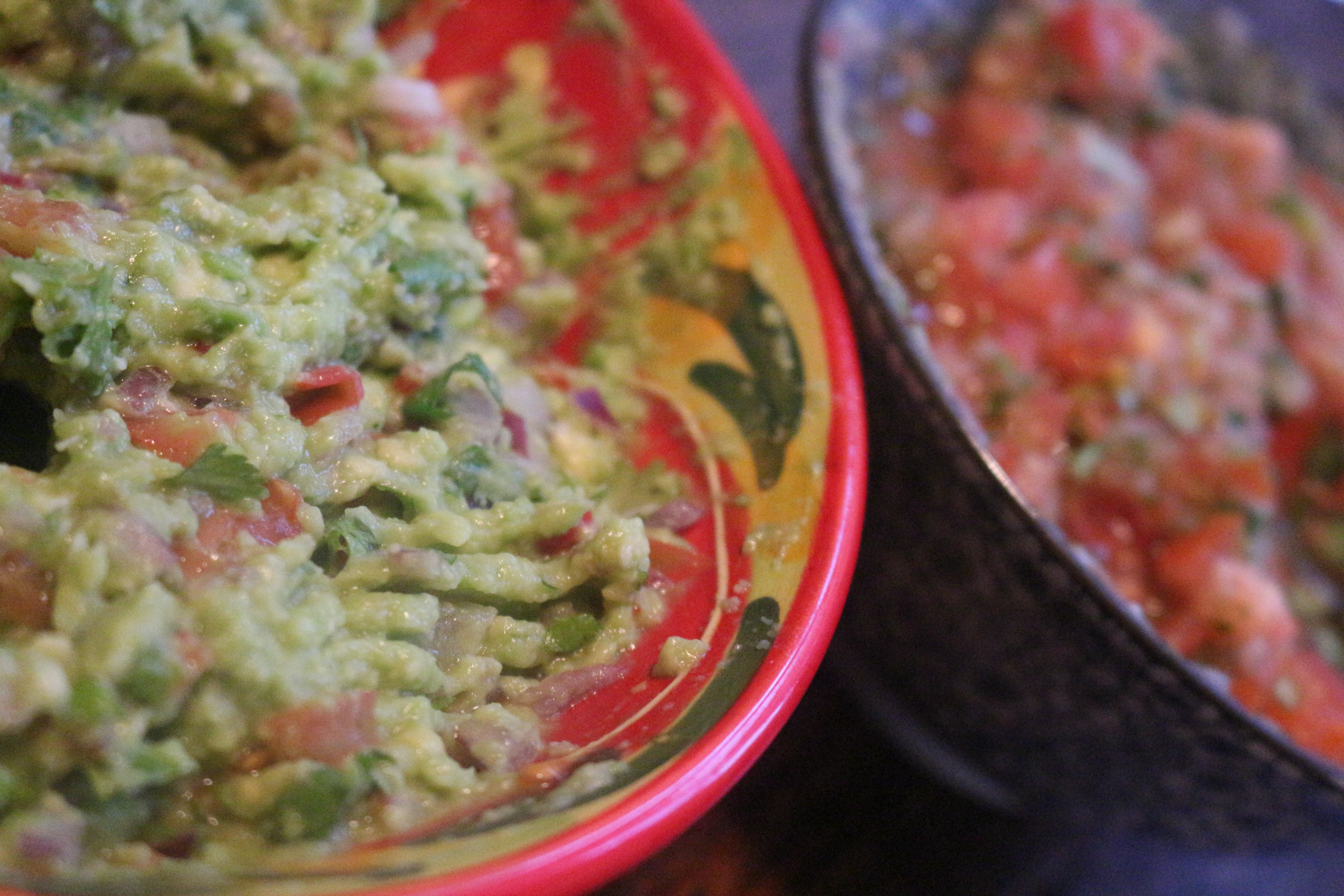 - For the guacamole, simply mix together all the ingredients in a bowl and squeeze over the lime juice. This is primarily for flavour but it also helps prevent to avocados from going slightly brown before you’re ready to serve (so lemon works just as well). Cover this and put it in the fridge too.