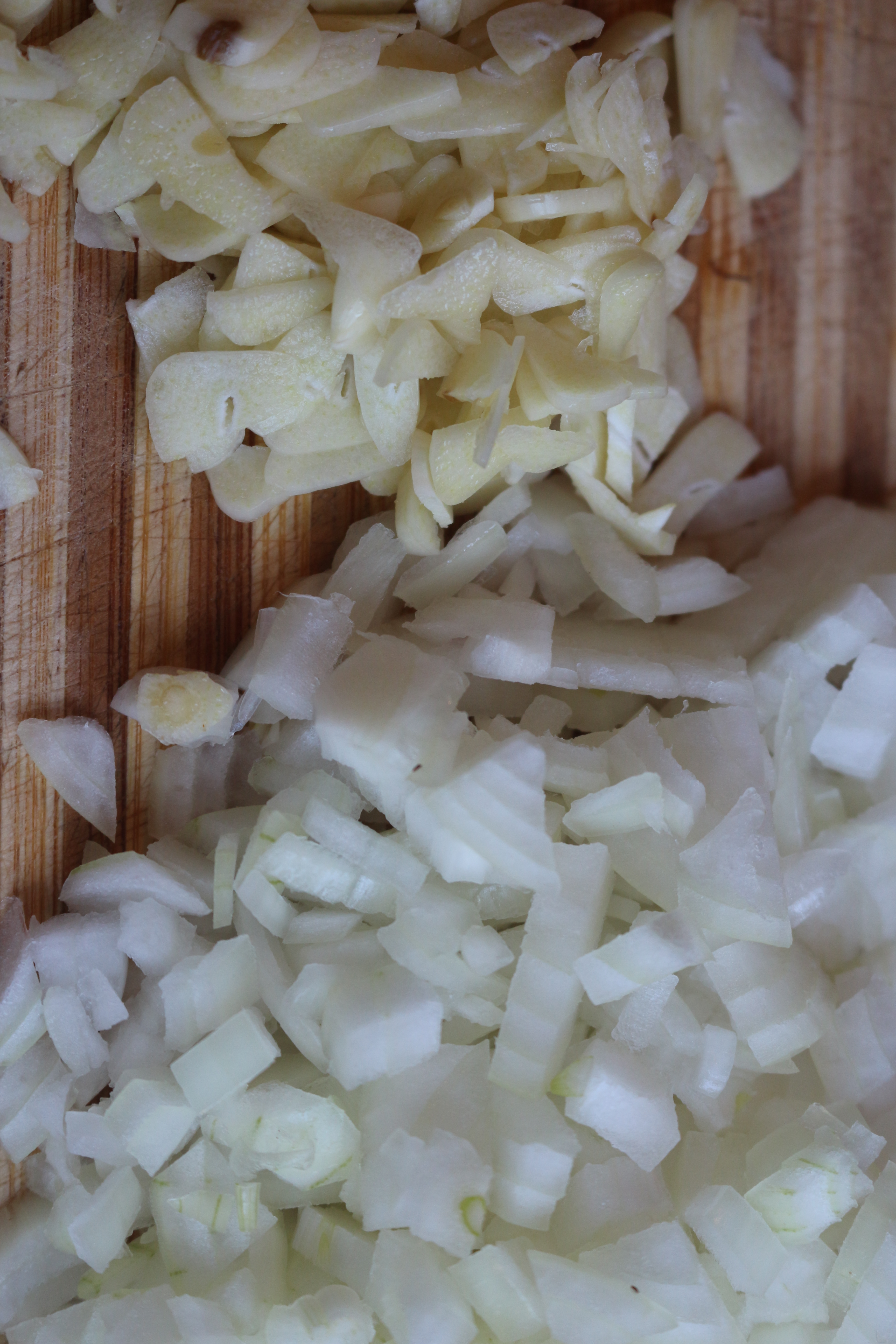 - Begin by preparing the onions and garlic. You want these to be quite finely chopped so that they just melt into the sauce.
