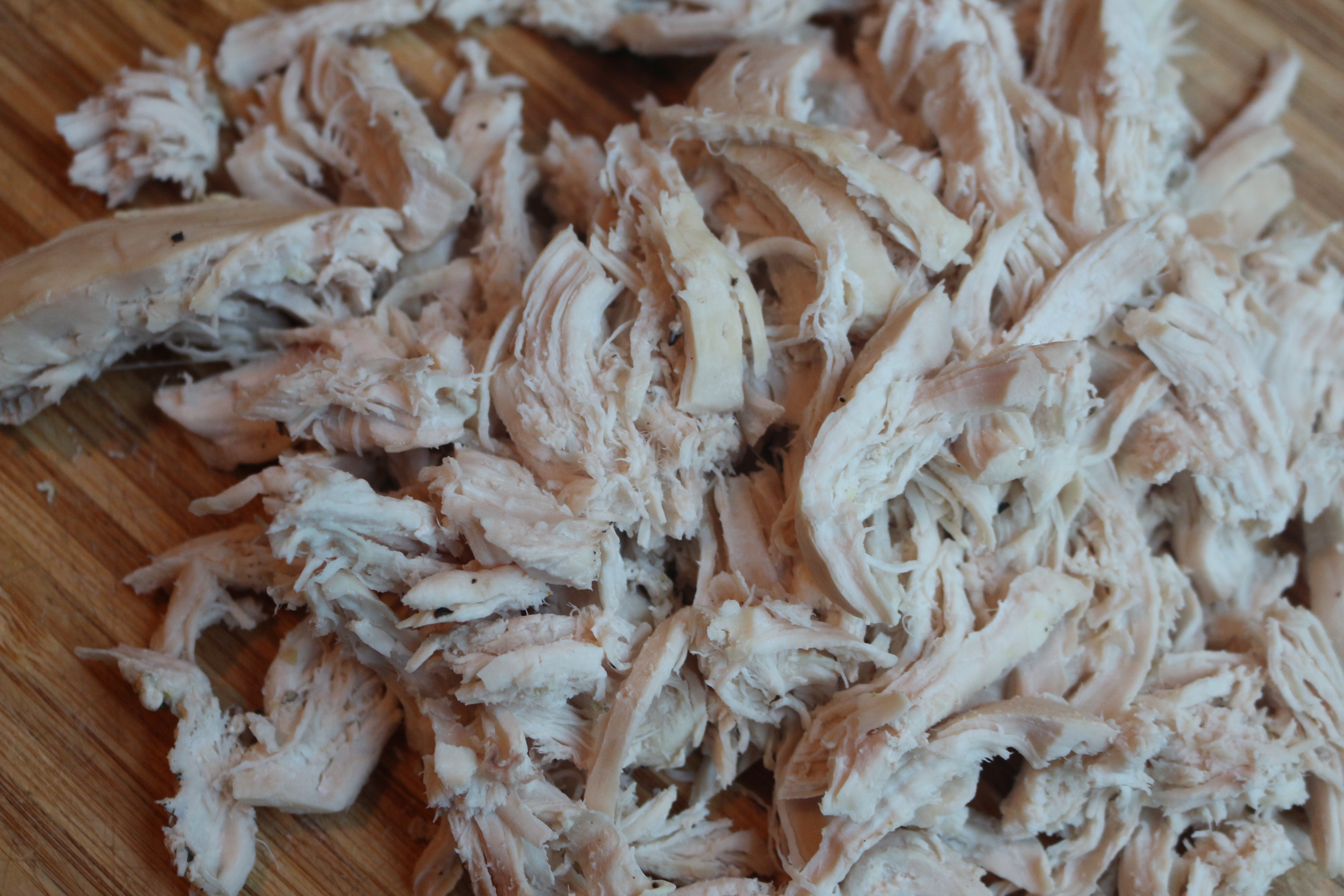- In a saucepan, place the whole chicken breast and cover with chicken stock (or just water), bring to the boil, then reduce to simmer and cover. Leave to cook for 10 minutes. Once cooked, remove and shred with 2 forks.