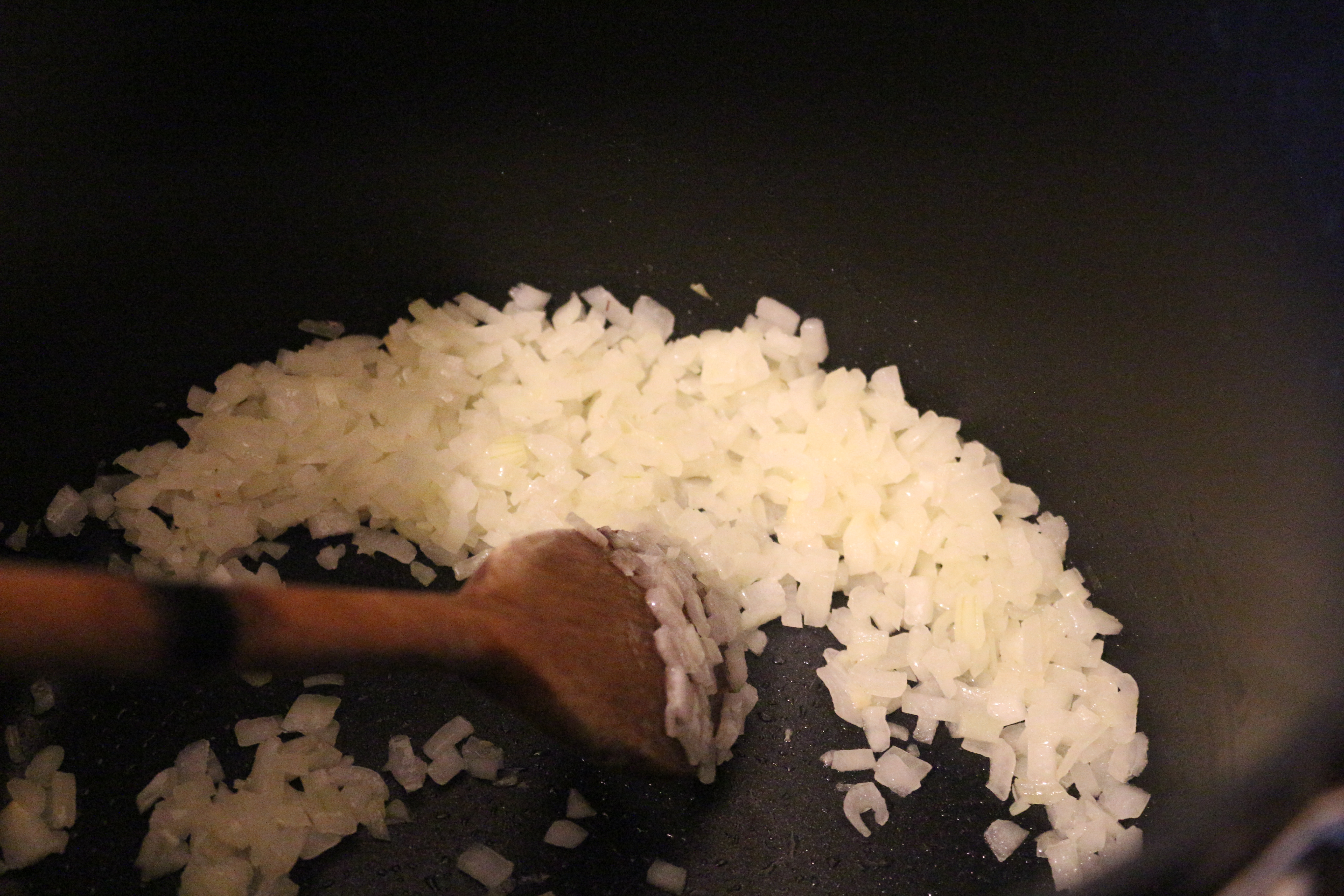 - Now to bring it all together. Over a medium-low heat, add a glug of oil to a pan. Once hot, add in the onions and gently saute for about 7 minutes until soft and translucent. Chuck in the garlic and cook for a further 5 minutes, stirring often. Season generously with salt and pepper.
