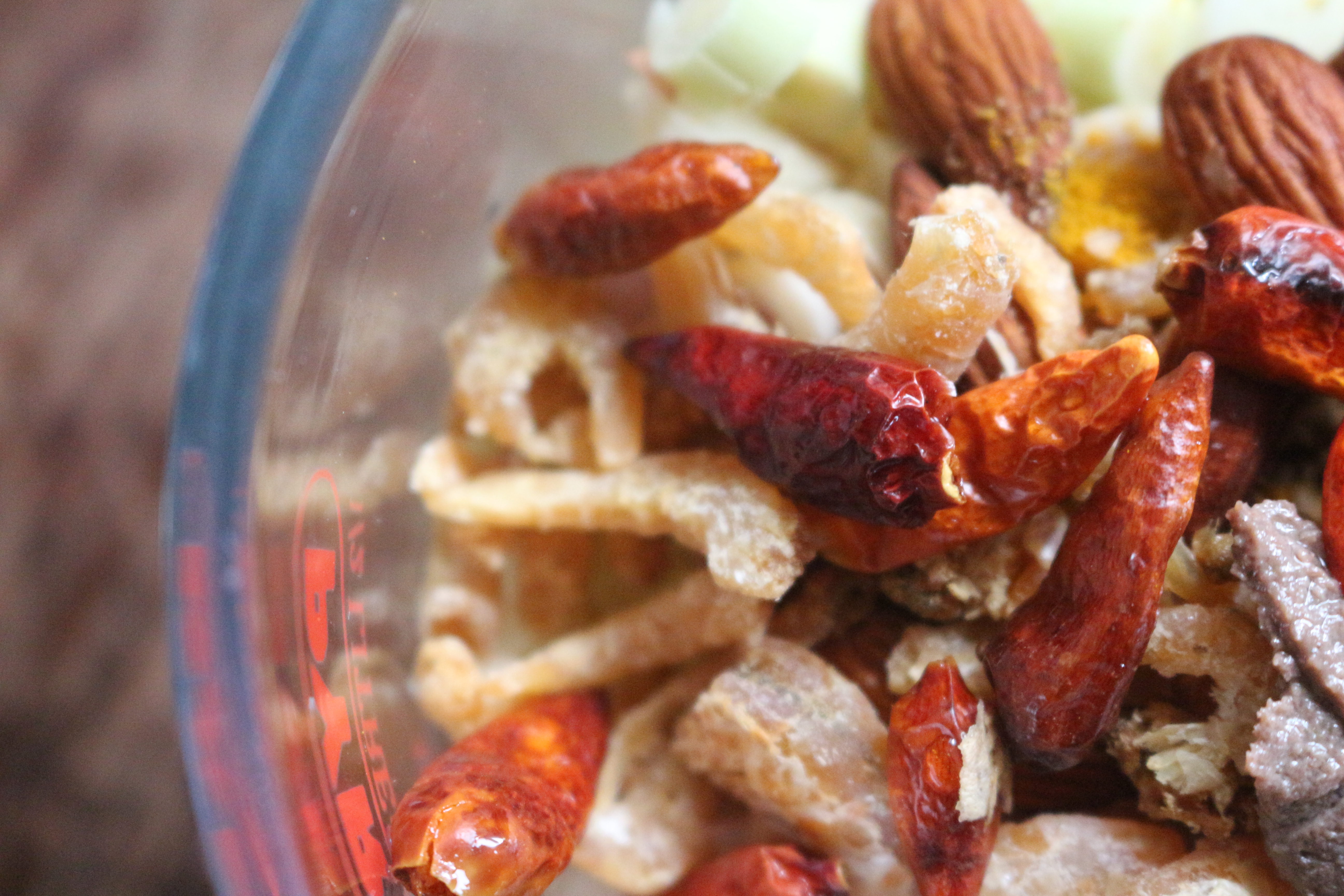 - 1 tbsp dried shrimp (if you have some! If not, just add in a little extra shrimp paste). Soaked in the same water as the chillies