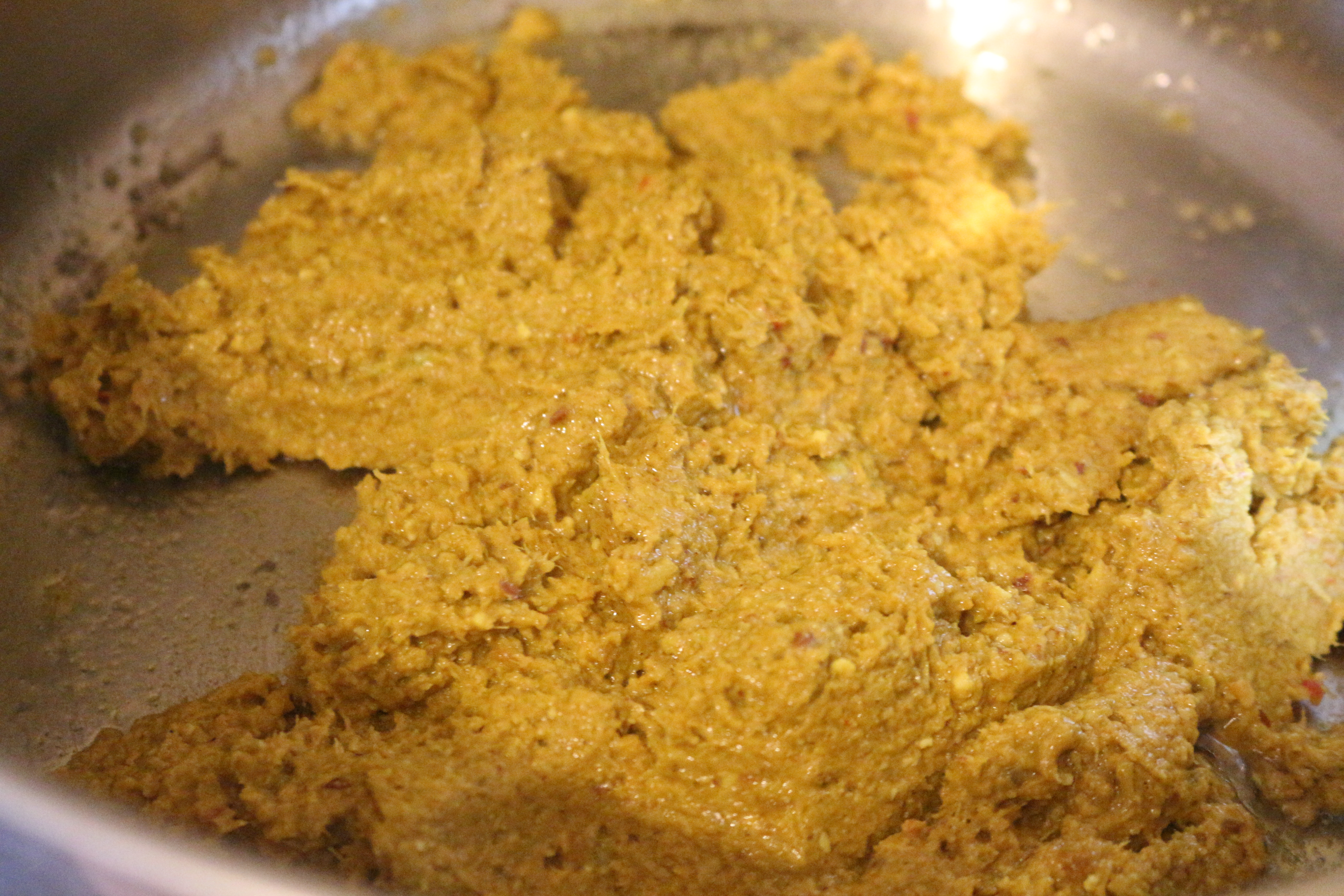 - When you’re ready to cook the laska, heat up 1 tbsp oil in a saucepan over a medium heat. Add the paste and fry off for a few minutes until fragrant.