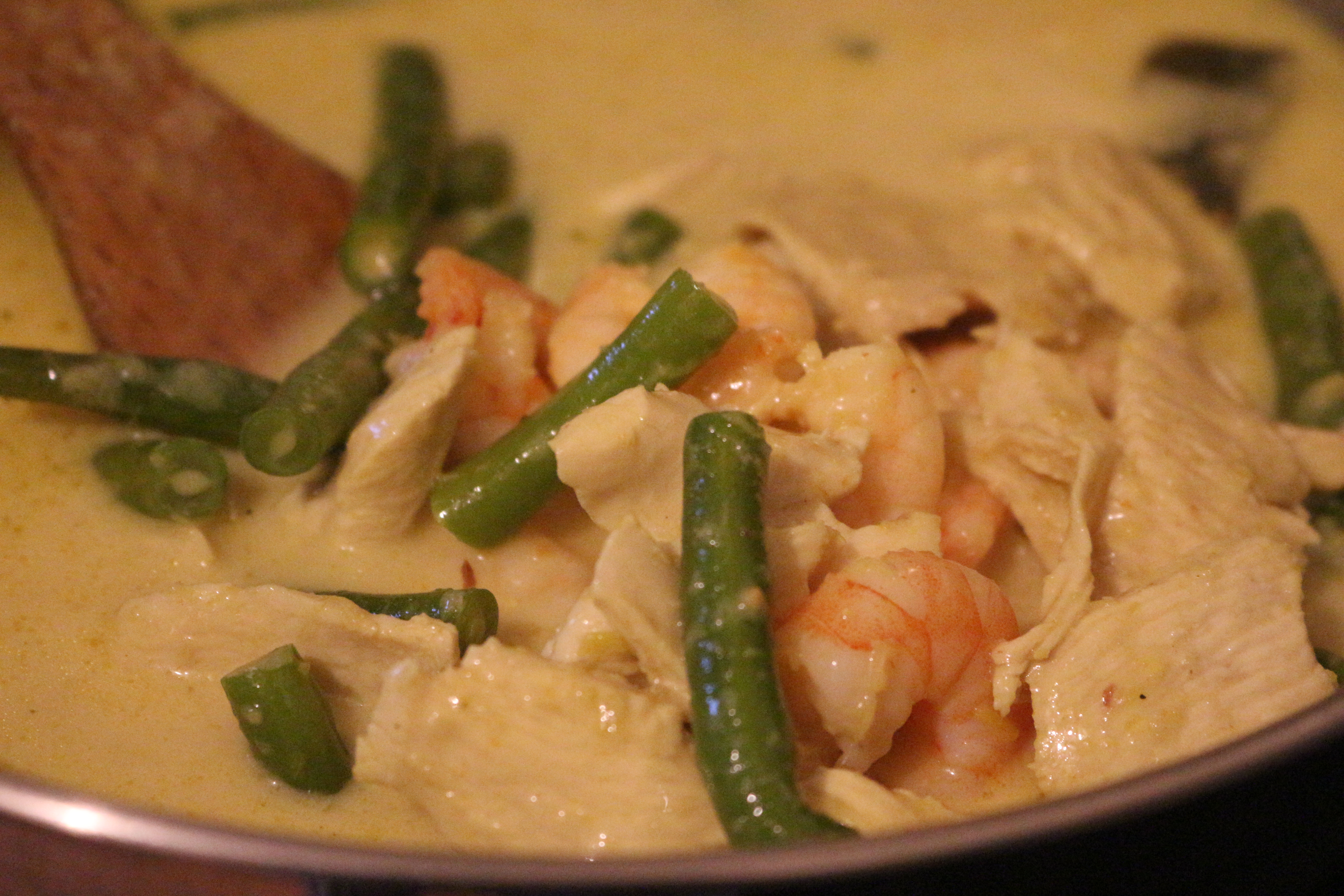 - Add the stock, green beans and lime leaves, gently bringing everything to a simmer. Cook until the beans are just about done. You want them soft enough to digest but still with a little crunch.